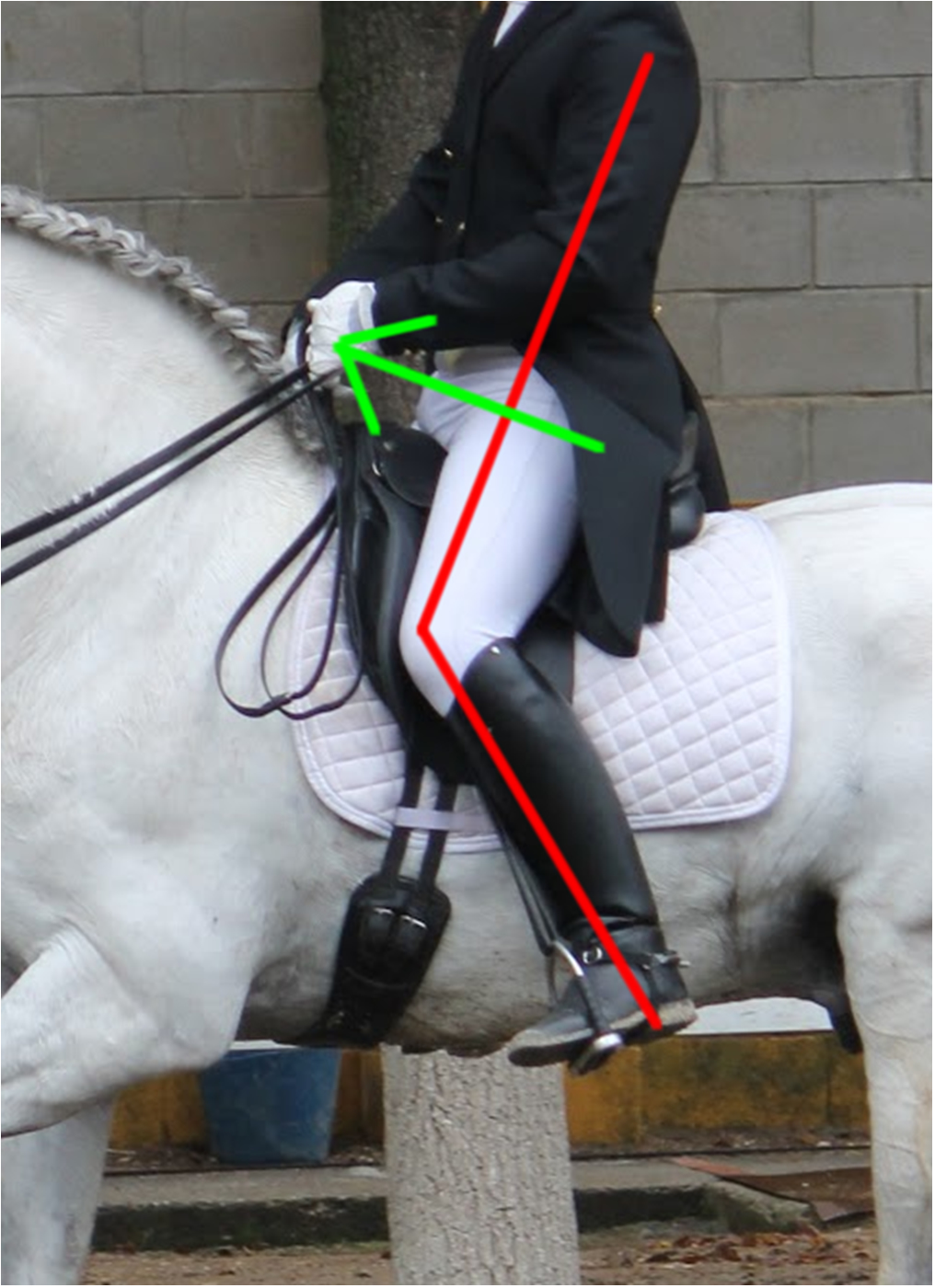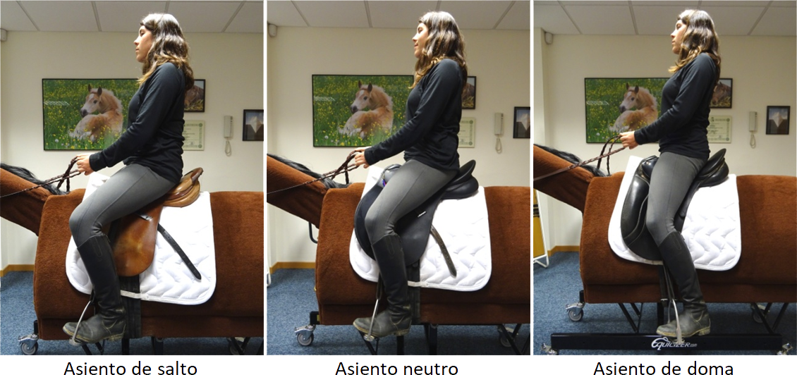 La silla de doma generalmente traba la posición de los estribos, bloqueando parte de su movilidad, y fija la posición de las piernas del jinete, que ya de por sí van retrasadas como consecuencia de la gran inclinación del borrén trasero de la silla. Con este tipo de montura, el jinete, para compensar el empuje hacia adelante que provoca la inclinación de la silla y no caerse encima del cuello del caballo, ha de forzar su espalda hacia atrás, provocando una posición en forma de < de su cuerpo, en el que tanto la espalda como las piernas van retrasadas. Llevar las piernas retrasadas permite a los jinetes que practican la disciplina de doma tener contacto continuado con el caballo a través de sus piernas, con la intención de favorecer la impulsión y el mantenimiento del ritmo necesarios para realizar los ejercicios. Cuidado, ya que muchos descuidan la posición baja de los talones.