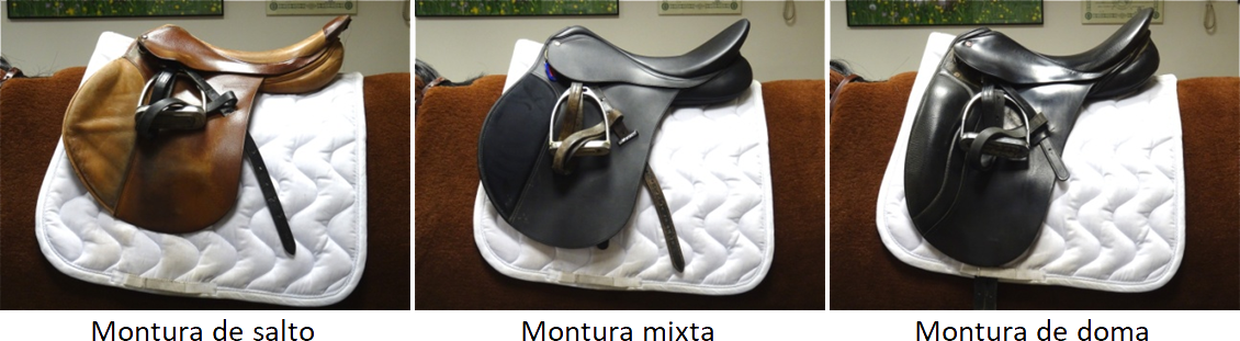 Derivado de lo explicado anteriormente, podemos introducir cuales son las principales diferencias entre los distintos tipos de monturas inglesas. Nos centraremos en la silla de doma, la de salto y la mixta. Independientemente de los faldones, sus principales diferencias están en los distintos grados de inclinación del borrén trasero y de cómo esta inclinación afecta a la posición del jinete o amazona.