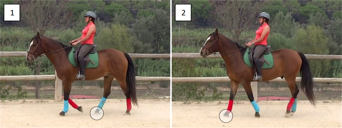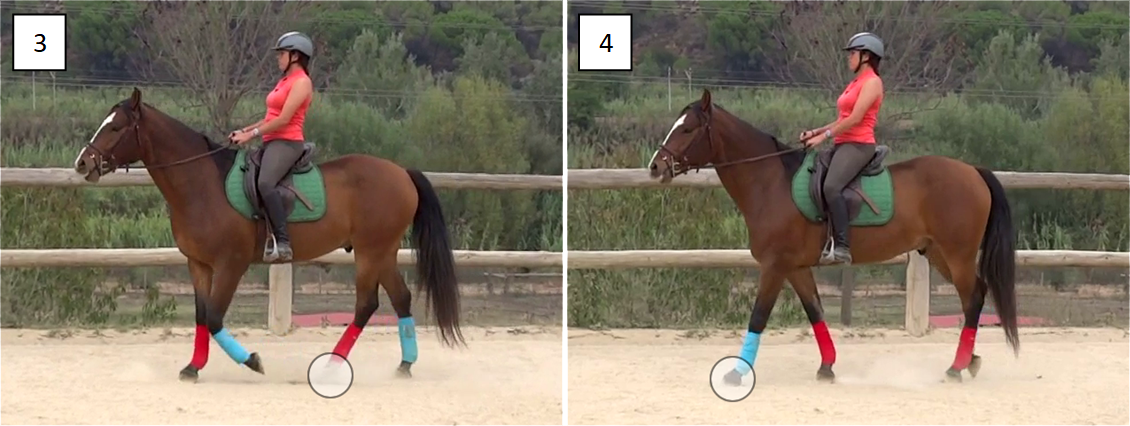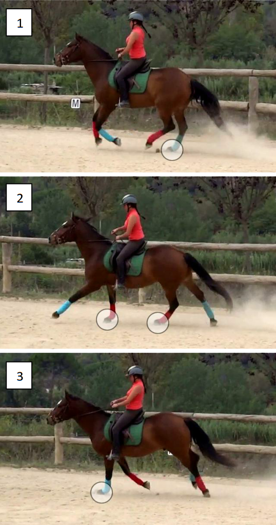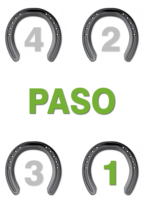 Todos hemos visto en algún libro de equitación esos dibujos en los que se ven las marcas de las pisadas numeradas. Esos dibujos tan importantes y a los que muchas personas no prestan atención o no entienden indican los tiempos de cada aire (cada vez que una extremidad del caballo toca el suelo dentro de un mismo ciclo de pisadas) y la forma en la que debería moverse el caballo en función de la mano (sentido) en el que avanza. Los gráficos ilustrativos con las pisadas y las fotos de ejemplo de la amazona montando que se incluyen en este artículo corresponden a un caballo que va a mano izquierda. Recordemos que llamamos bípedo a la combinación de una mano y un pie del caballo. Los bípedos pueden ser diagonales o laterales. Un tranco es la distancia recorrida desde que una extremidad del caballo toca el suelo hasta que esa misma extremidad vuelve a tocar el suelo en el siguiente ciclo de pisadas.
