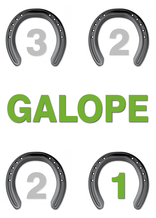 Aire asimétrico, saltado y oscilante, de tres tiempos, al que le sigue un instante de suspensión. La velocidad del caballo al galope oscila entre los 20 y los 30 km/h. Existe el galope tendido o de carreras, que es un aire también asimétrico, pero de cuatro tiempos, en el que el caballo puede alcanzar los 65 km/h.